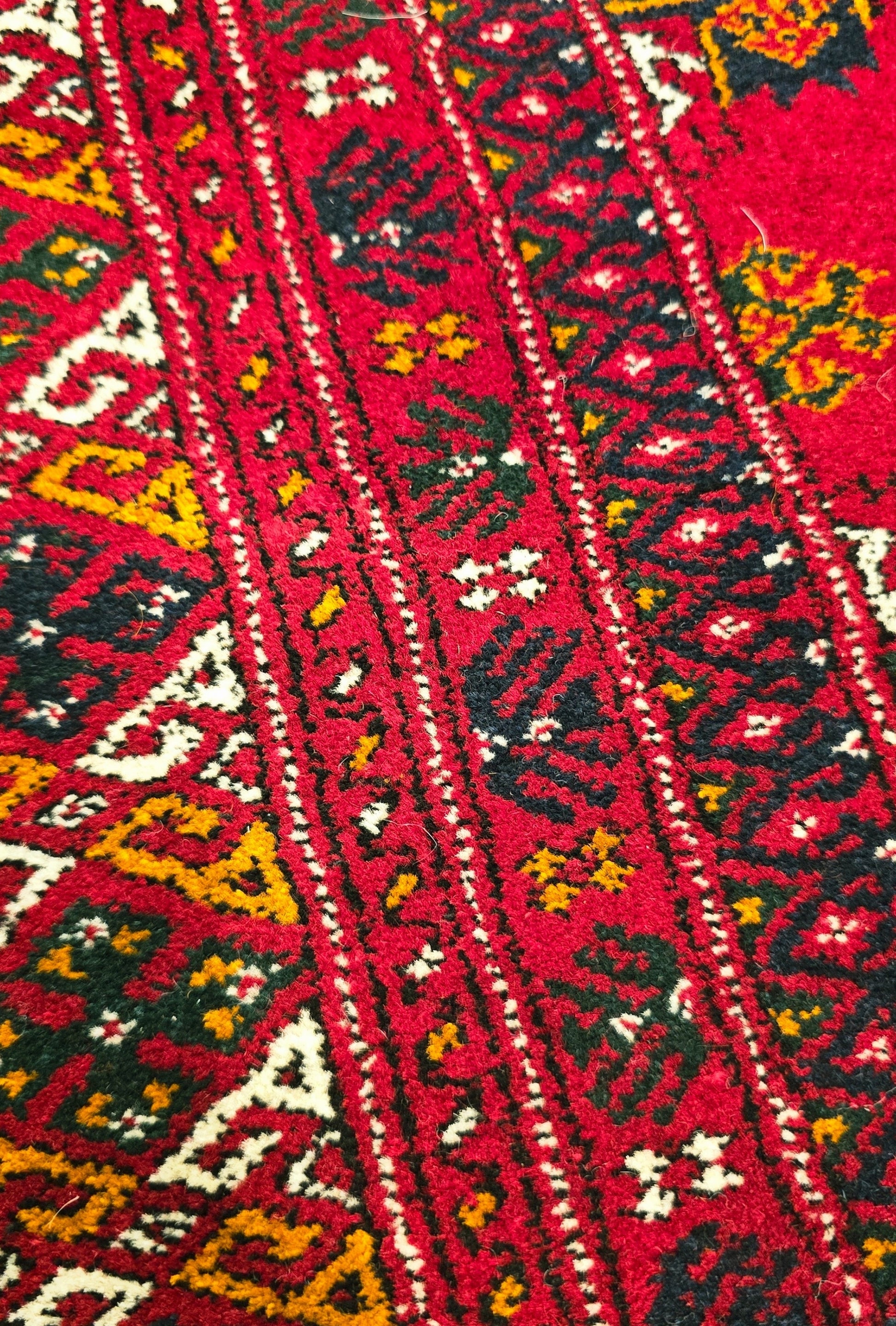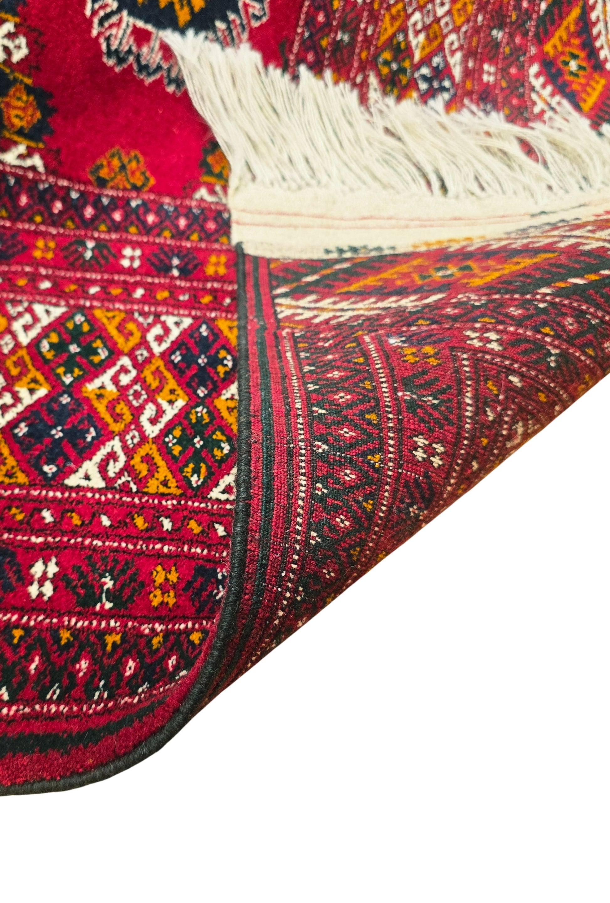 Rare Yomud Eagle Gul Rug – This handknotted vintage wool rug (207 x 310 cm / 7 x 10 ft) is an authentic masterpiece of the Yomud tribe, featuring the iconic Kepse Eagle Gul motif. Carefully crafted in the Balkan province of Turkmenistan, it showcases bold tribal geometry, rich red tones, and generations of skilled artistry.