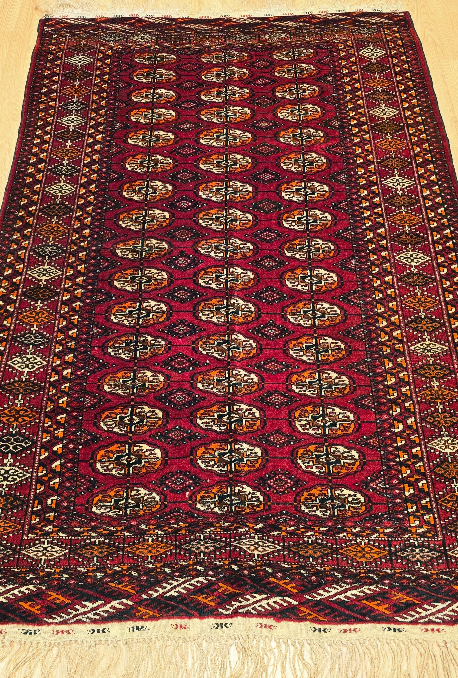 Bring history underfoot with this Antique Handknotted Turkmen Wool Rug, woven in the 1970s by three master artisans of the Tekke tribe in Turkmenistan’s Ahal province. Measuring 125 x 190 cm (4' x 7' ft) and weighing 5.5 kg, this rare piece radiates authenticity, tribal charm, and masterful technique.