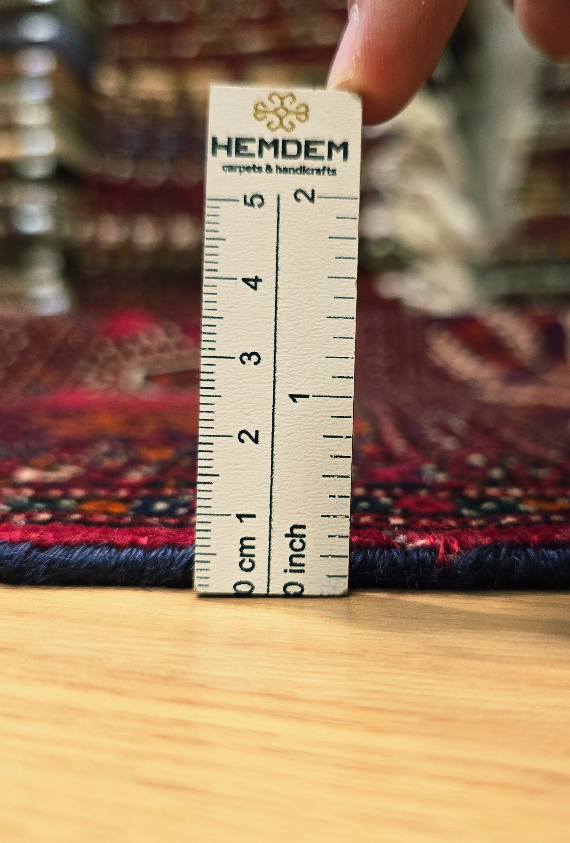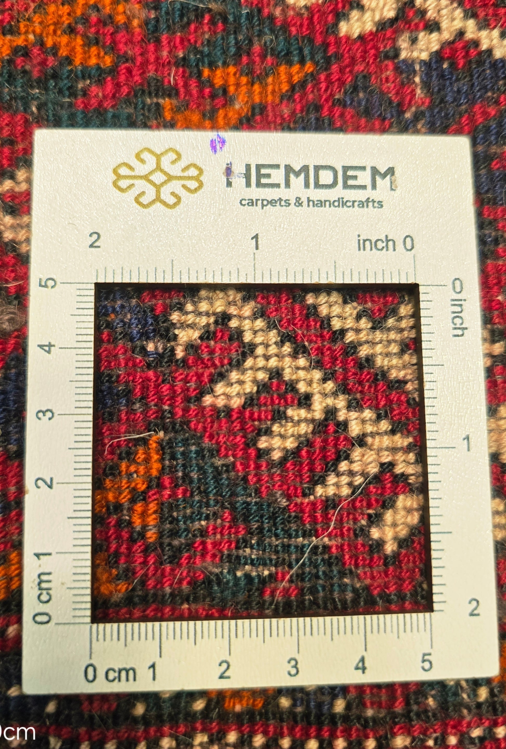 Handcrafted using 100% wool pile and foundation, this rug features deep red tones, accented by traditional geometric Tekke gul motifs, offering both aesthetic depth and symbolic meaning. With high knot density (~228 KPSI) and natural dyes, it embodies eco-conscious craftsmanship and timeless durability.